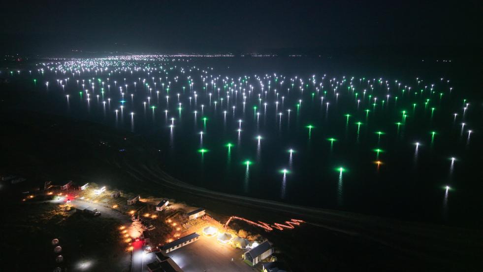 10月17日,龙羊峡库区水面亮起盏盏渔灯(无人机照片)。新华社记者 齐芷玥 摄