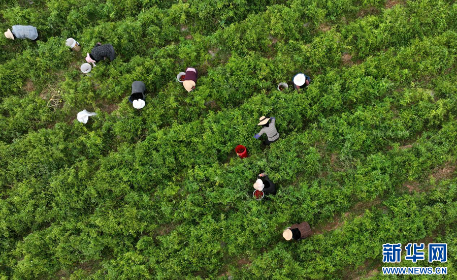 2025年9月11日,在青海省海东市循化撒拉族自治县清水乡下滩村,当地群众在采摘线辣椒(无人机照片)。新华社记者 周盛盛 摄
